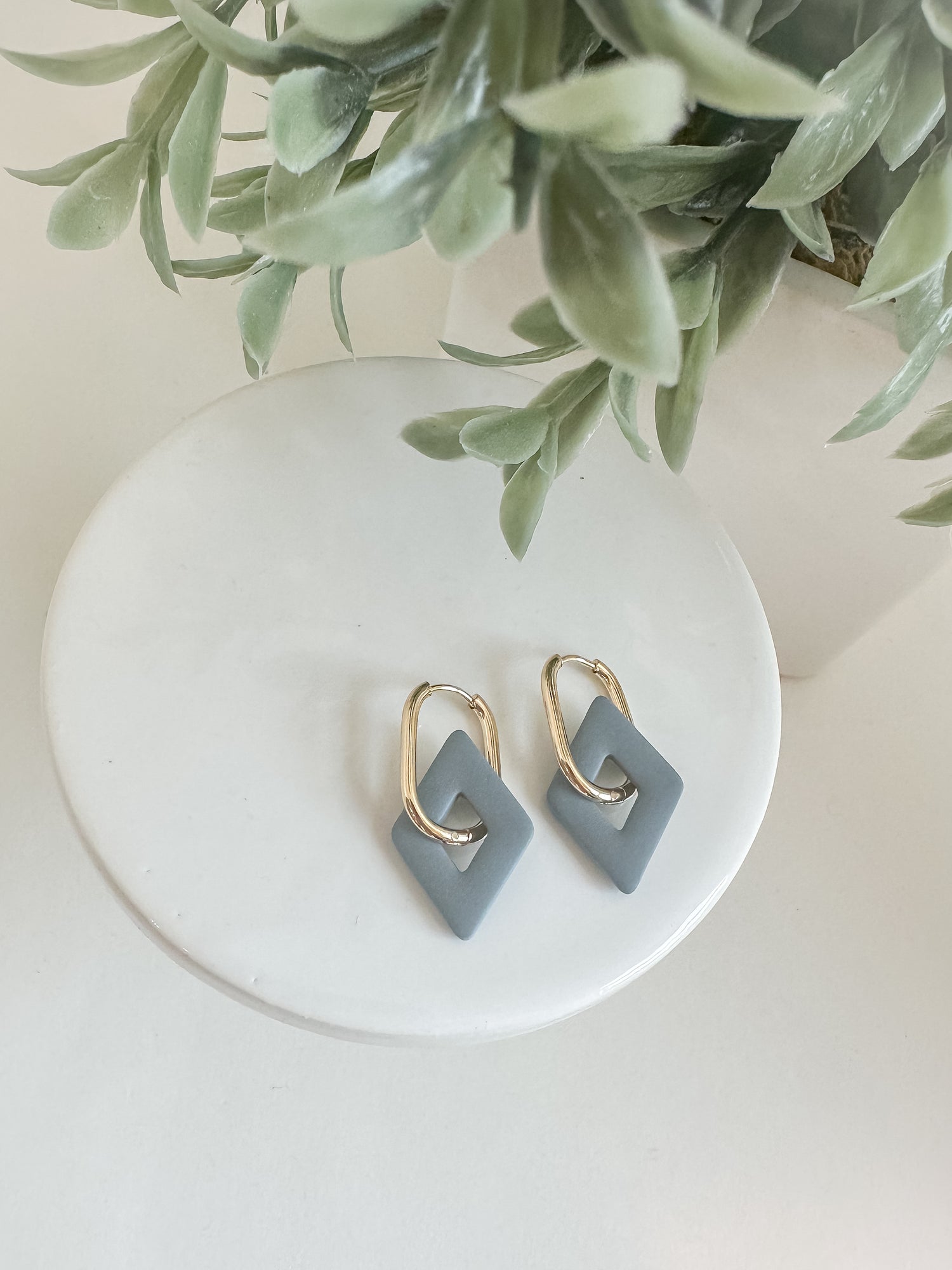 18k gold plated earrings with polymer clay slate blue diamond pendant.